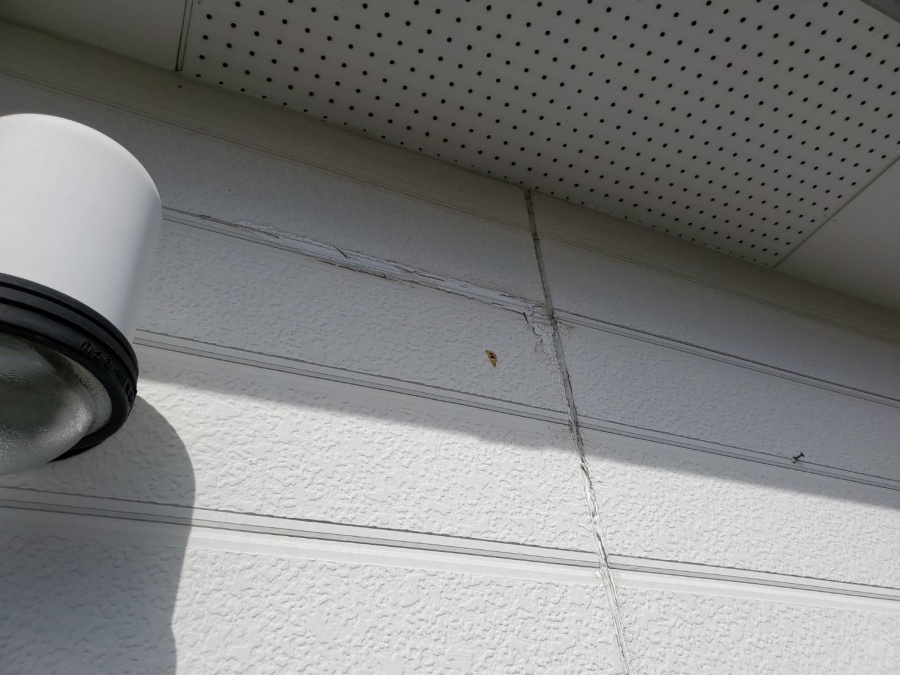 さらに、南側の外壁では、長年の紫外線による影響で、シーリング材(コーキング)が弾力を失い、ひび割れが発生していました。このまま放置すると、雨水が内部へ浸入し、建物全体の耐久性にも悪影響を及ぼす恐れがあります。